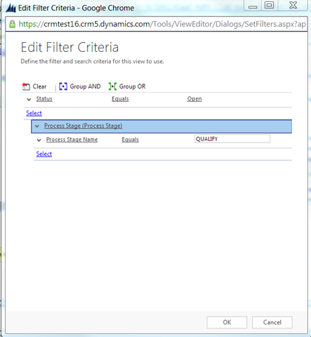 Click on Edit Filter Criteria and select related entity Process Stage, select criteria as in below screenshot: