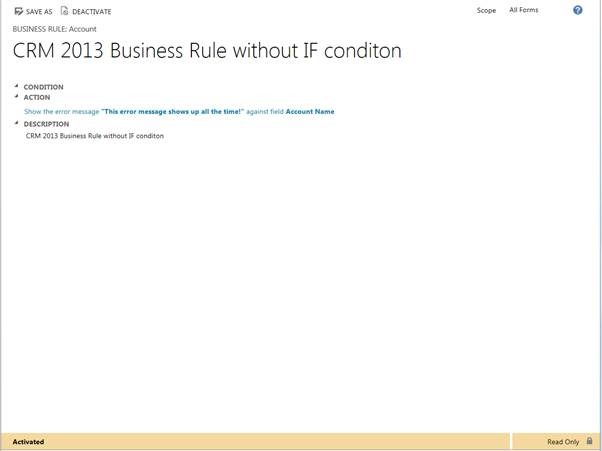 I wonder if anybody ever tried this before. Often we need to trigger a business rule on form irrespective of the form values, something which always needs to be done. In CRM 2013, one of my colleagues pointed out to me that there is no actual need of putting any If condition. So I tried it with account name field, showing error message at all times on Account name field in Account entity. First I tried if Business rule will be allowed to be saved and activated. To my surprise, it is allowed in CRM 2013, just have a look below: