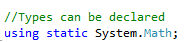 1. Ability to declare types as Static( In the example below, I have declared System.Math as static with using clause,