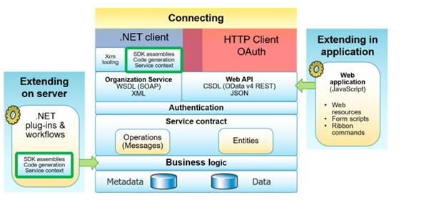 · .Net Client : In case you want to develop some .net application to connect to Dynamics CRM and achieve some other desktop applications for instance developed on WPF, etc. you can extend using .Net Client features either by using XRM.Tooling or SDK assembly provided with SDK.