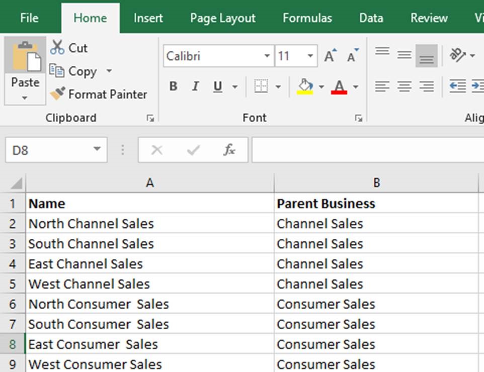 2. Take an excel sheet and mark the Business unit name and Parent Business unit name: