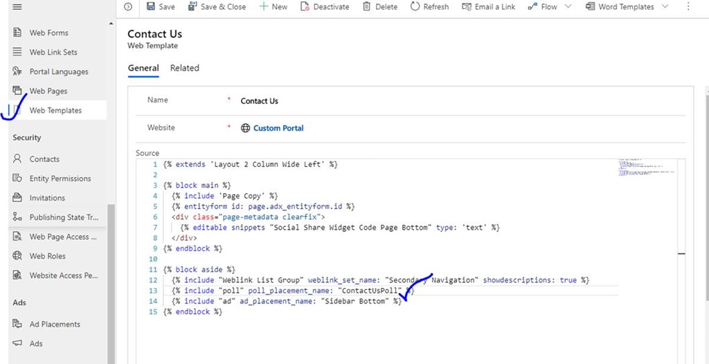 Step 5: Keep the Poll placement name from last step copied : ”ContactUsPoll”. Next we need to edit the web template. Liquid template knowledge helps here. However, we will just be editing a Poll name. Locate the Web Template named Contact Us and edit the tag as below: