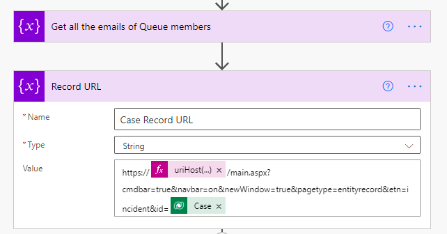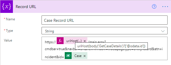 4. Add an action “Initialize Variable” and rename it to “Record URL” – This is used to store the URL of Case record