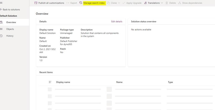 Navigate to the intended solution, Click Overview and select Manage Search index:
