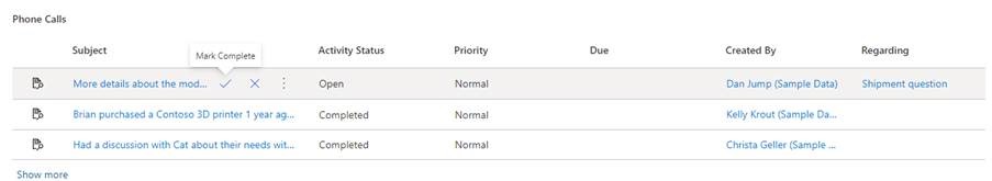 For another entity which is activity let us see what Quick Actions are available (Mark Complete, Close, Set Regarding, Assign and Email a link ):