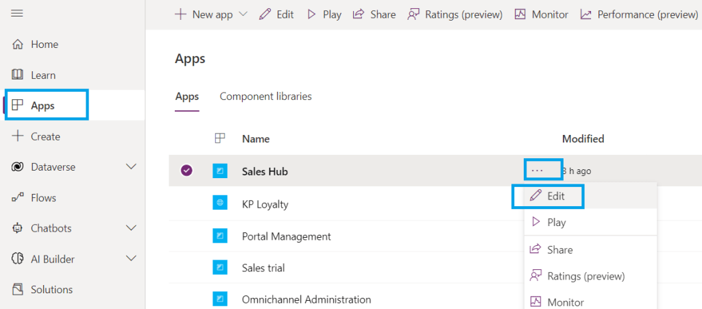 After that you will get a new interface in which you have to select the three dots of the entity where the command button you to added Click on edit Command bar: