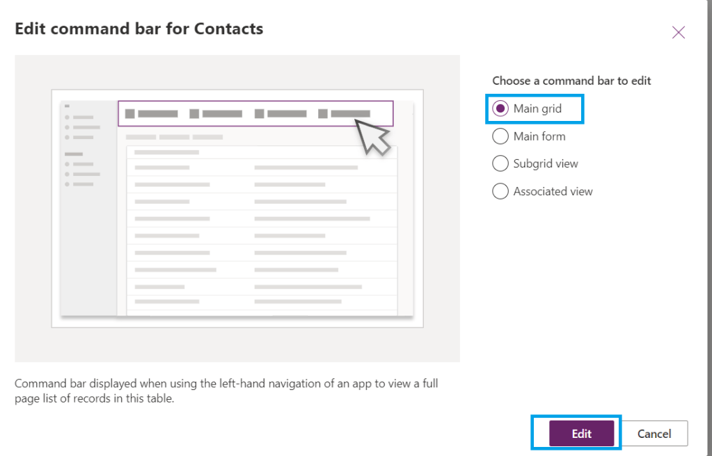 You can choose from the Main grid, Main form, Sub-grid and Associated view to add buttons.