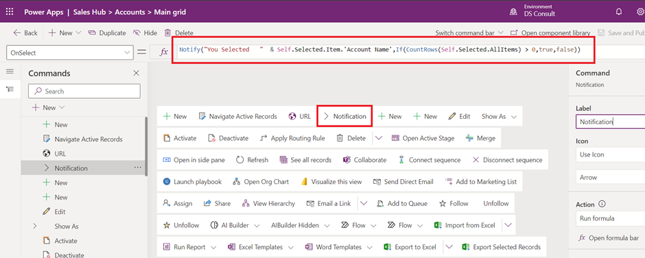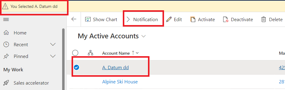 On selecting a single account named “A.Datum dd” and clicking on the “Notification” button, you can see above that the name of the record is showing in the notification section.