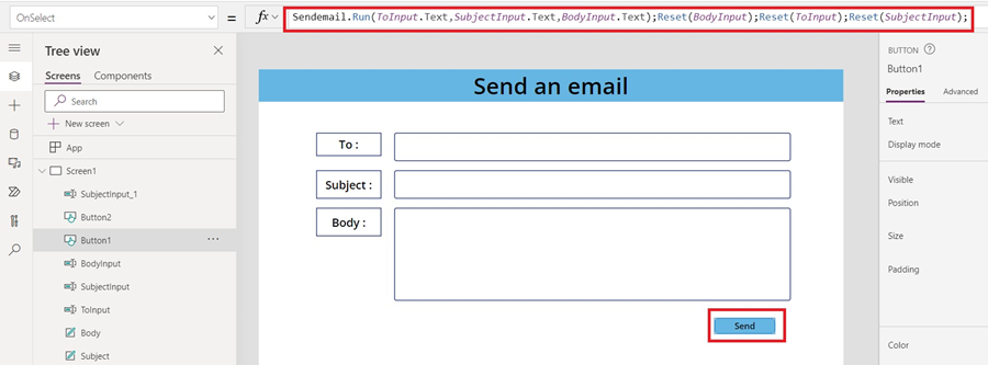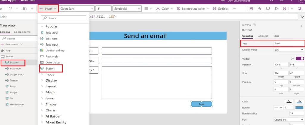- Change the text properties of the button to “Send” from the properties pane on the right.
