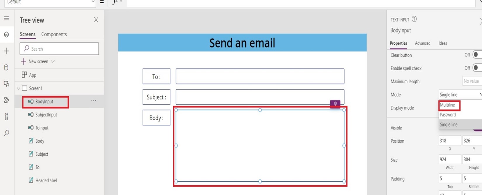 - Change the display mode of “Bodyinput” (text input) “single line” to “Multiline.”