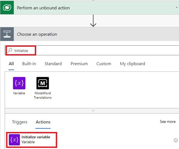 - Select Microsoft Dataverse action “Perform an unbound action.”
