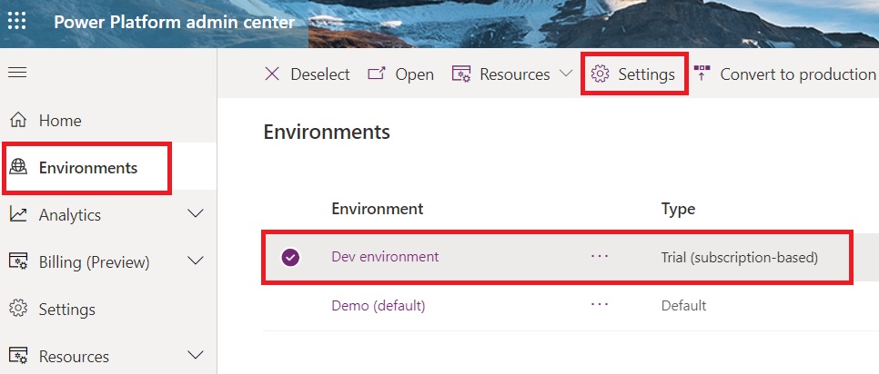 - On the left pane, select “Environments”, select the environment where you want to enable this feature, and then select “Settings.”