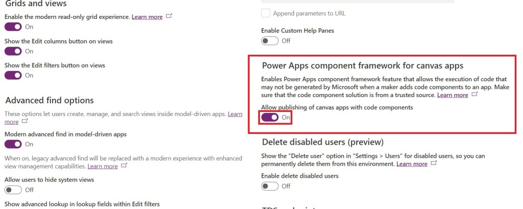 - Turn on “Power Apps component framework for canvas apps,” then select “Save.”