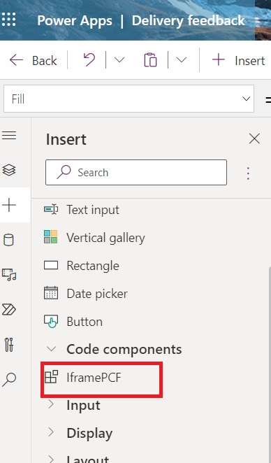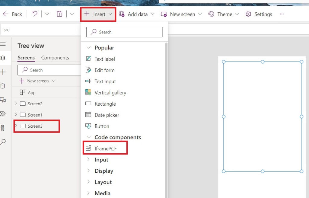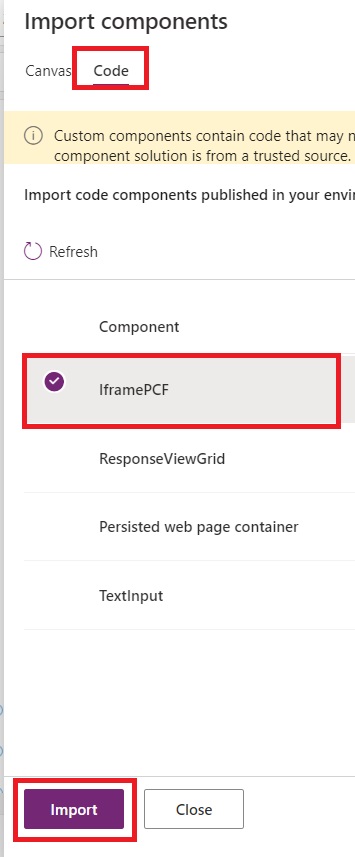 - Select “IframePCF” from the code components.