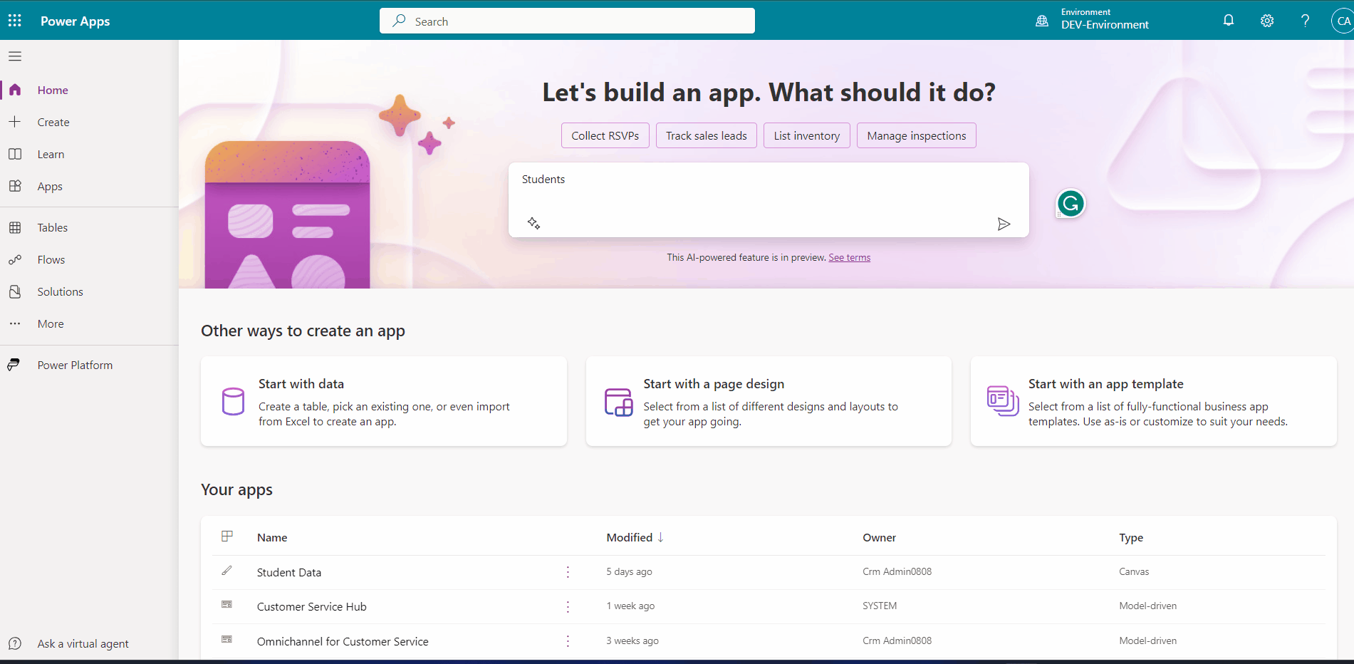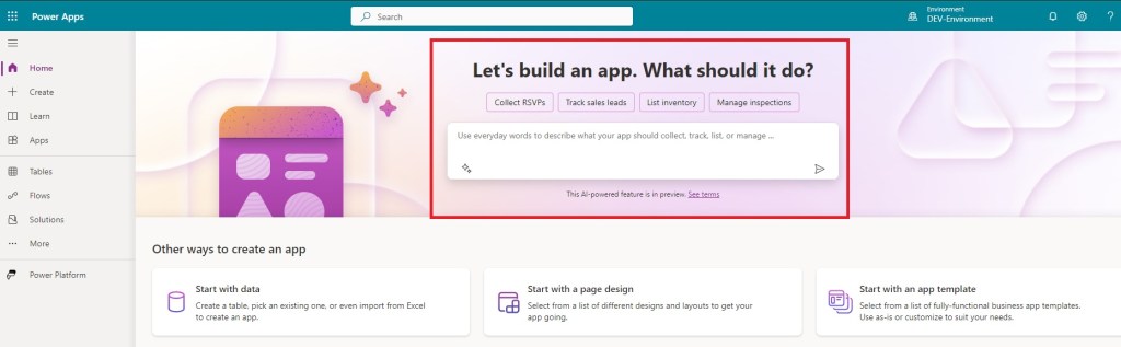 - After the recent update of June 2023, we can see the text box on the “Home” page of the Power platform for creating the Canvas app just by describing it.