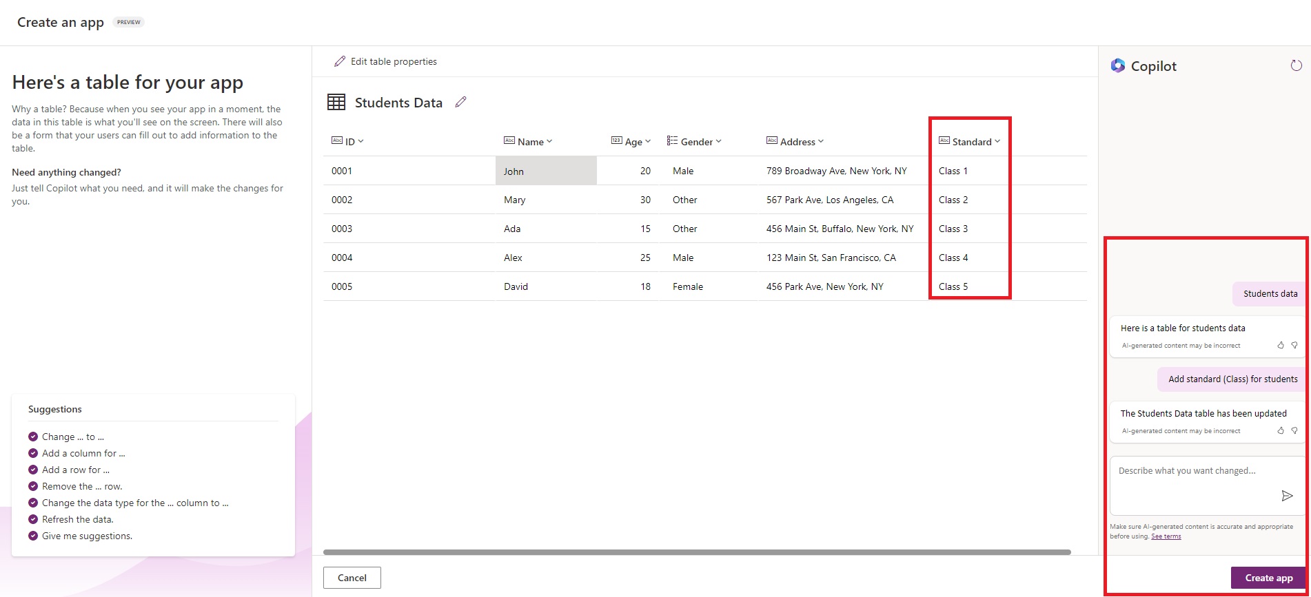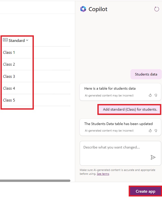 - Click on “Create app” after adding columns.