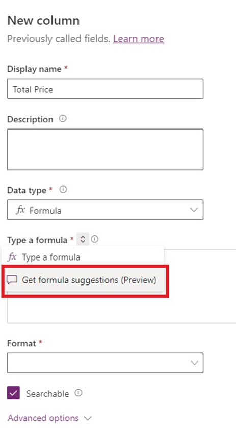 - Select data type as “Formula”, and switch “Type a formula” to “Get a formula suggestions”.