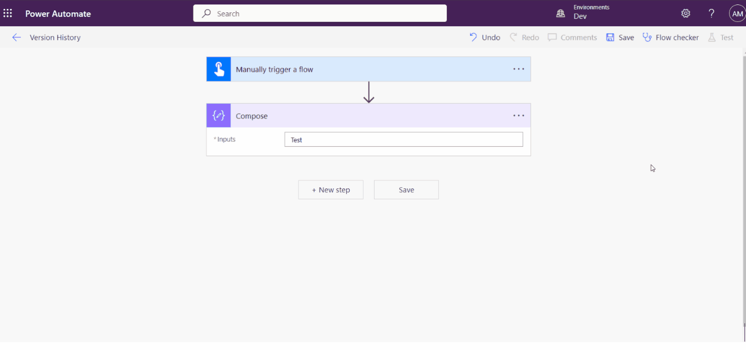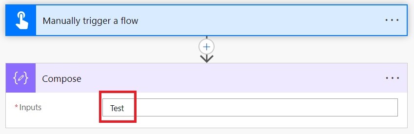 - Here I have added a “Compose” action in the flow, with a text value in it.